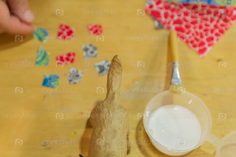 Мастерская декупажа. вид сверху на стол с фигуркой собаки, бумагой и клеем