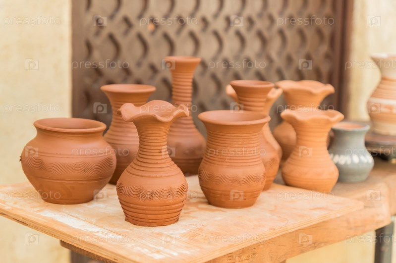 Разные глиняные горшки на деревянном столе