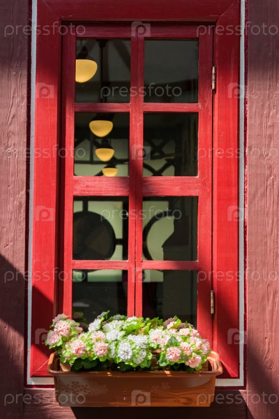 Закрыть красное деревянное окно с цветущими цветами в горшке