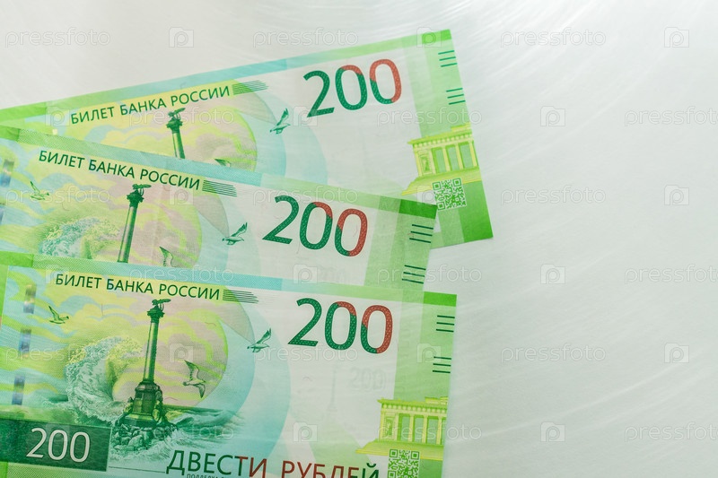 Новые российские банкноты на белом фоне. двести рублей. Наличные бумажные деньги
