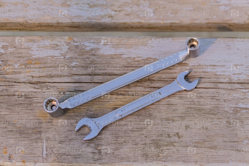Два металлических гаечных ключа на деревянном фоне. Набор рабочих инструментов для обслуживания и ремонта