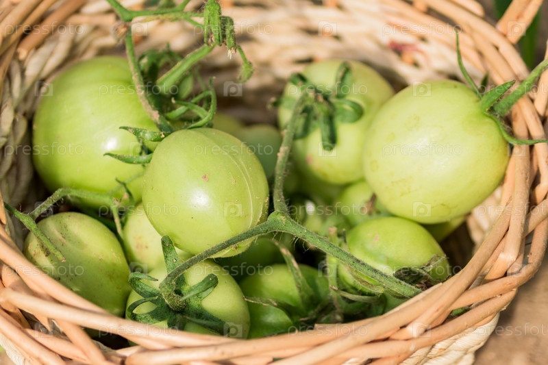 Новый урожай или урожай. Зеленые свежие помидоры в корзине