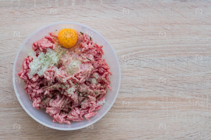 Фарш в миске с сырым яйцом, специями и нарезанным луком для приготовления котлет, выборочный фокус