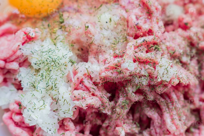 Фарш в миске с сырым яйцом, специями и нарезанным луком для приготовления котлет, выборочный фокус