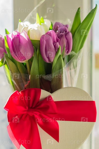Красивые тюльпаны и подарок в коробке сердца с красным бантом