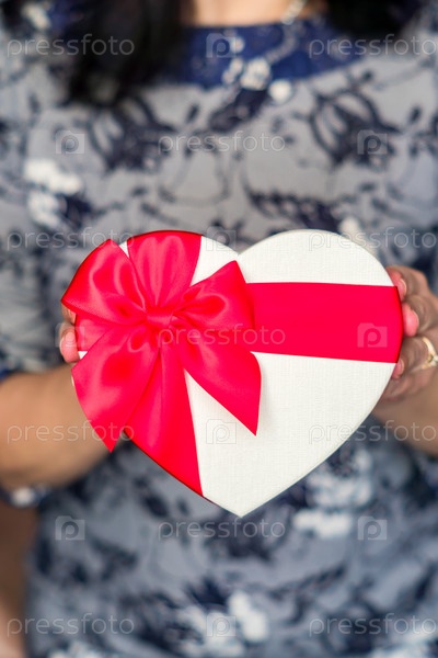 Темноволосая женщина держит подарочную коробку в форме сердца с красным бантом. Концепция Нового года, Рождества и Дня святого Валентина