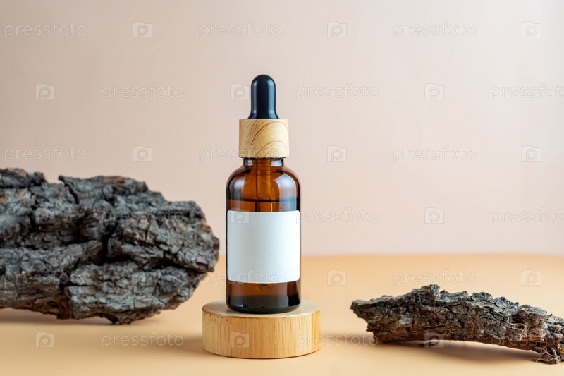 Макет коричневой косметической бутылки с пипеткой и пустой этикеткой на деревянном подиуме с корой дерева в качестве украшения для косметической фотографии на бежевом фоне