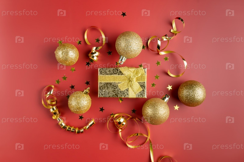 Новогодние украшения к Новому году. Праздничный красный фон с золотыми сверкающими безделушками, растяжками, конфетти и подарочной коробкой