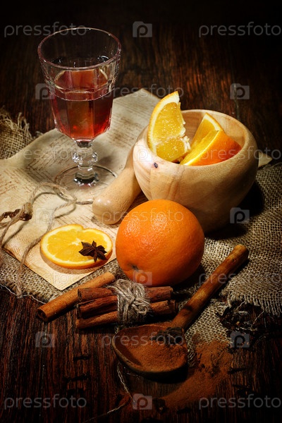 Глинтвейн с медом, апельсином и корицей на деревянном столе