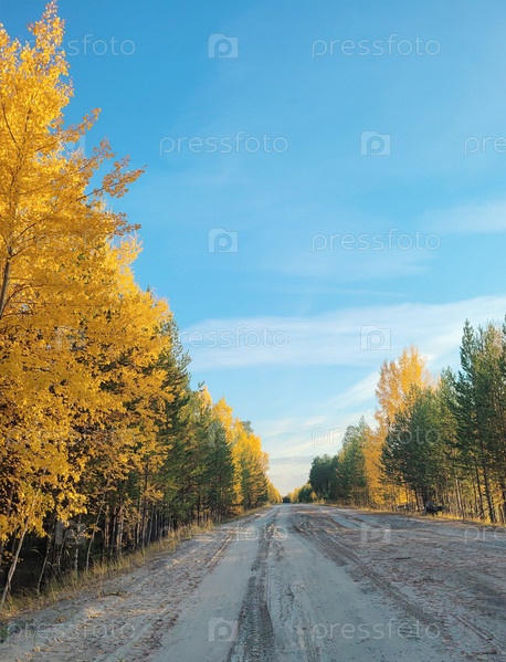Дорога с осенними желтыми деревьями по краям