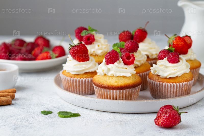 Кексы, украшенные ягодами на кухонном столе