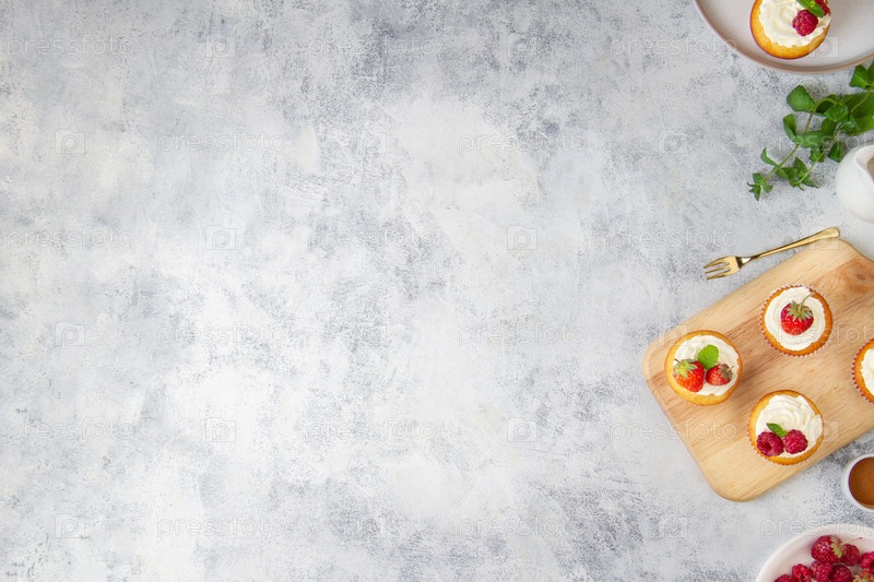 Бетонный фон с границей кексов на деревянной доске