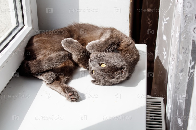 Серый кот лежит на подоконнике