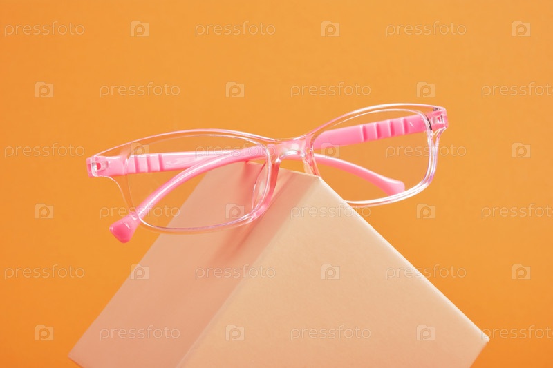 Розовые детские очки на бежевой подарочной коробке, коричневый фон, пространство для копирования, скидки и акции в магазине оптики