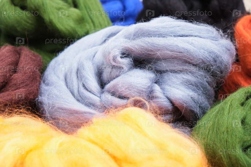 Несколько мотков окрашенной натуральной овечьей шерсти для валяния на столе