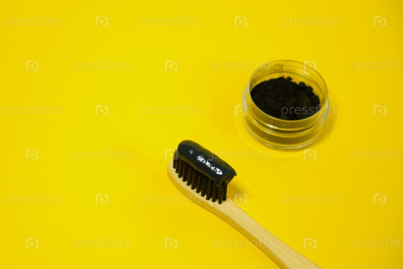 Зубная щетка с черной угольной зубной пастой. Черная зубная паста на зубной щетке с таблетками активированного угля
