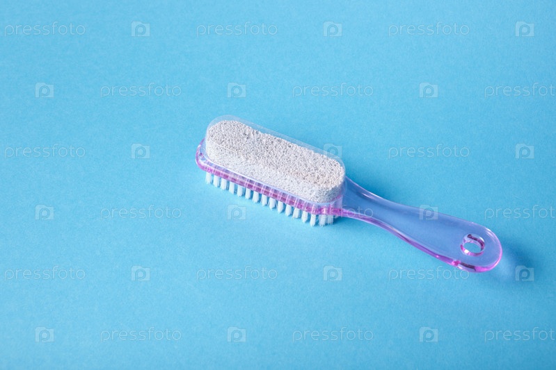 Пемза с розовой пластиковой ручкой и щеткой для педикюра на синем фоне, гладкая кожа стопы