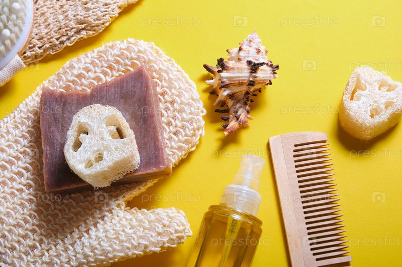 Аксессуары для ванной комнаты с нулевыми отходами на желтом фоне