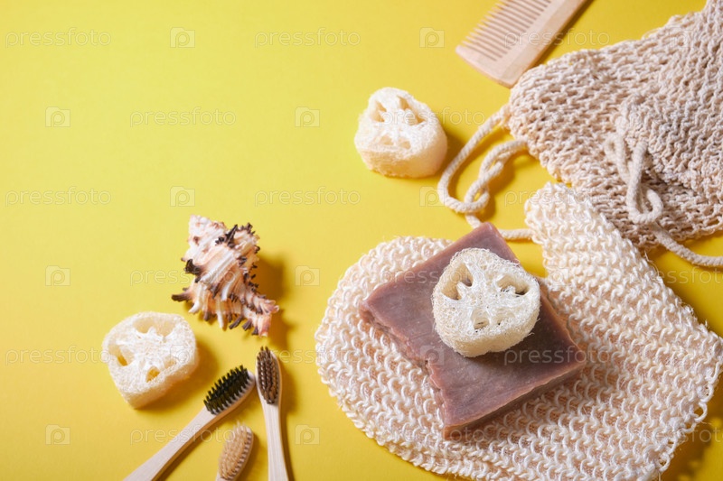 Аксессуары для ванной комнаты с нулевыми отходами на желтом фоне