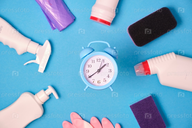 Фон услуги по уборке с бытовой химией и красным будильником. Экономия времени в концепции уборки дома