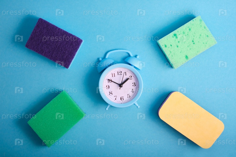 Чистящие средства деревянный фон, вид сверху. Кухонные губки, салфетки из целлюлозы, щетка и будильник. Концепция домашних дел. Время генеральной уборки