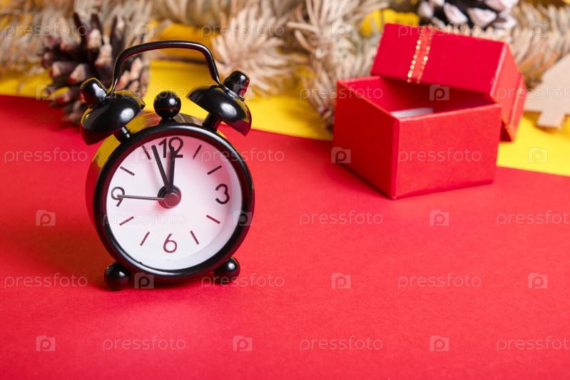 Черный маленький будильник и рождественский декор на красном фоне
