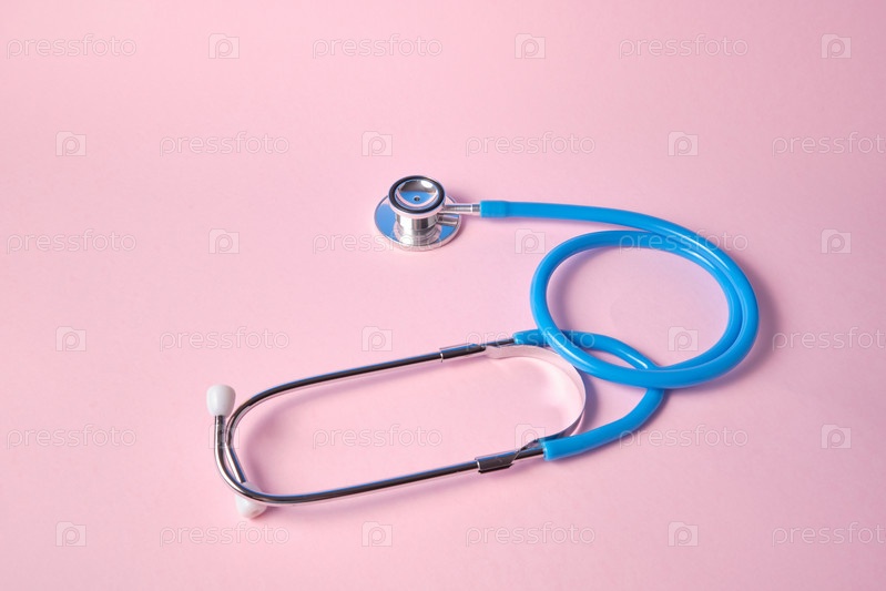 Синий стетоскоп на розовом фоне. Для проверки концепции сердца или здоровья