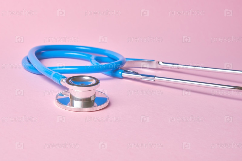 Синий стетоскоп на розовом фоне. Для проверки концепции сердца или здоровья