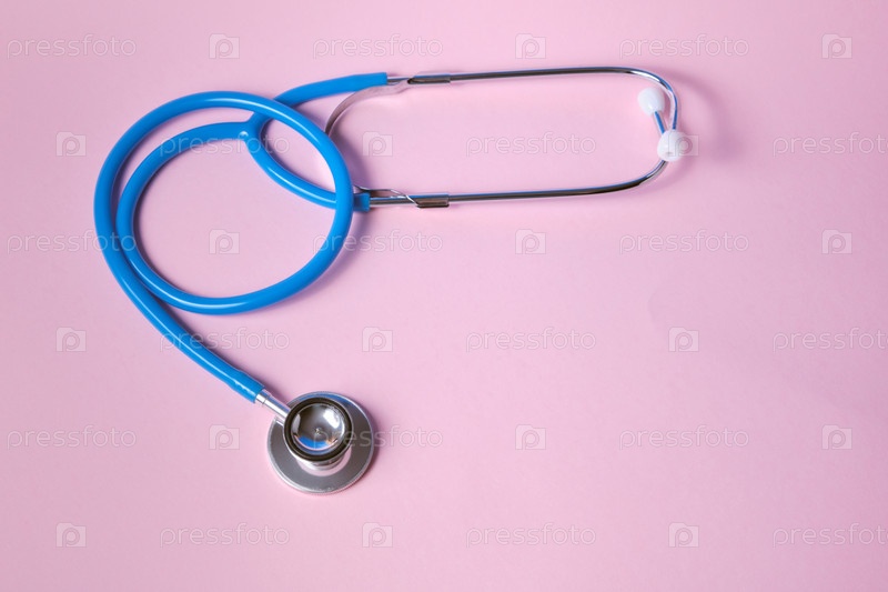 Синий стетоскоп на розовом фоне. Для проверки концепции сердца или здоровья