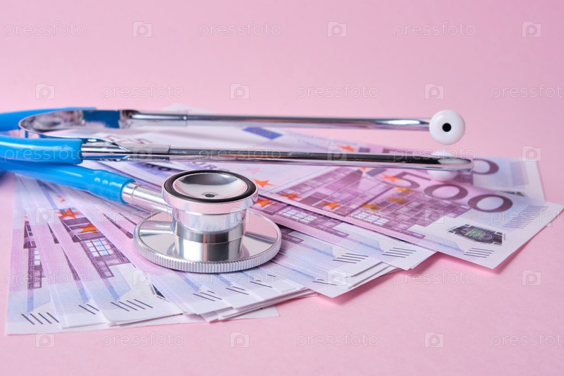 Стетоскоп и банкноты евро на розовом фоне, символ стабильности, роста и падения валют, мониторинг обменного курса на бирже