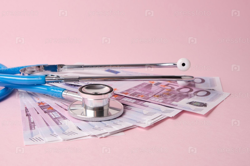 Стетоскоп и банкноты евро на розовом фоне, символ стабильности, роста и падения валют, мониторинг обменного курса на бирже