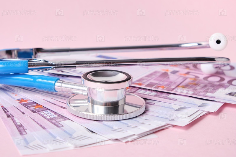 Стетоскоп и банкноты евро на розовом фоне, символ стабильности