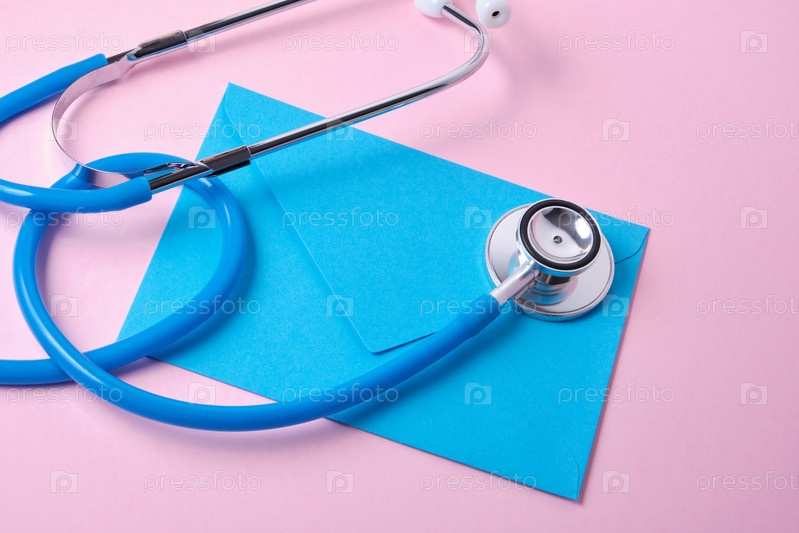 Стетоскоп и синий конверт на розовом фоне день врача, концепция дня здравоохранения