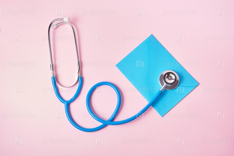 Стетоскоп и синий конверт на розовом фоне