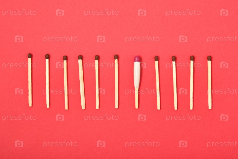 Спички расположены в ряд на красном фоне, одна водонепроницаемая спичка среди простых спичек
