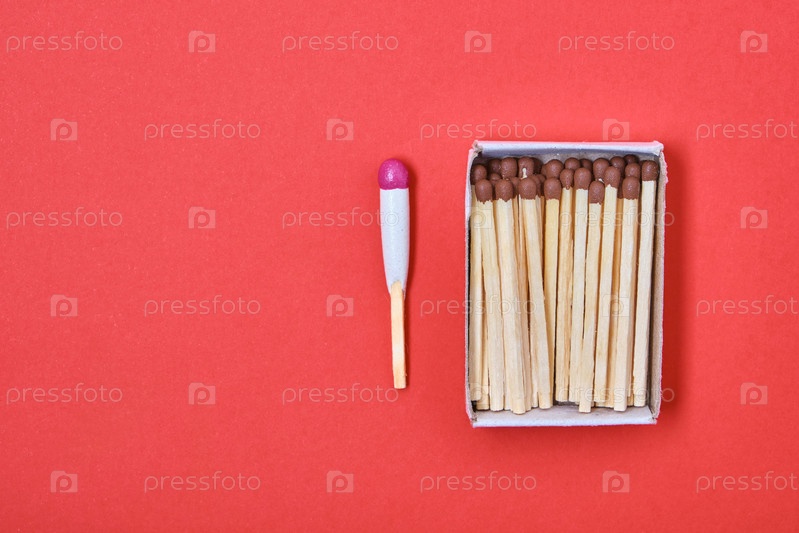 Охота на водонепроницаемые спички и бумажную коробку с простыми спичками на красном фоне