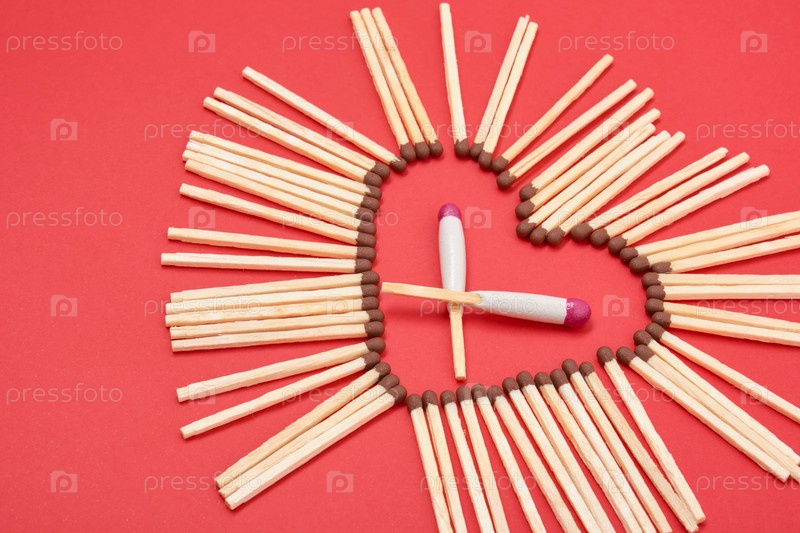 Спички в форме сердца на красном фоне