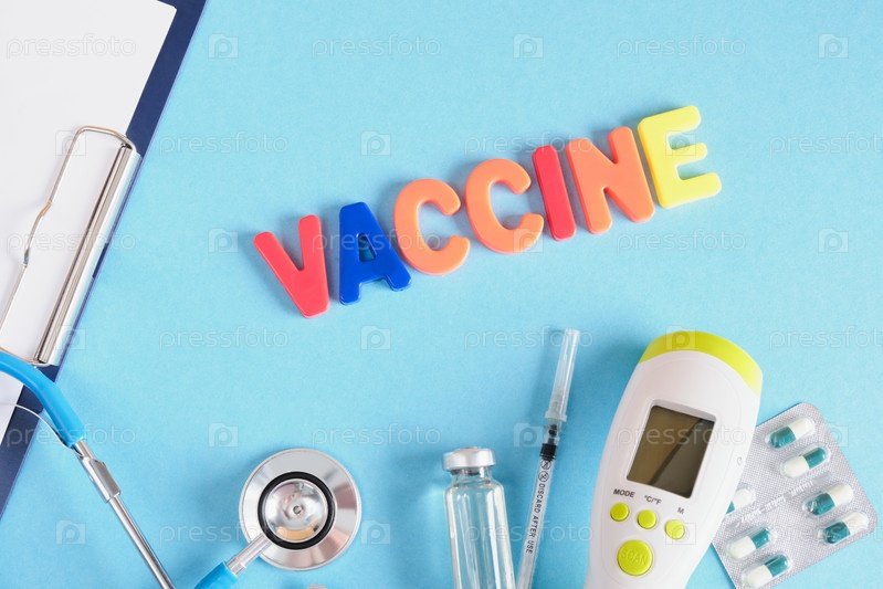 Надпись вакцина из пластиковых букв и медицинских инструментов на синем фоне, вид сверху