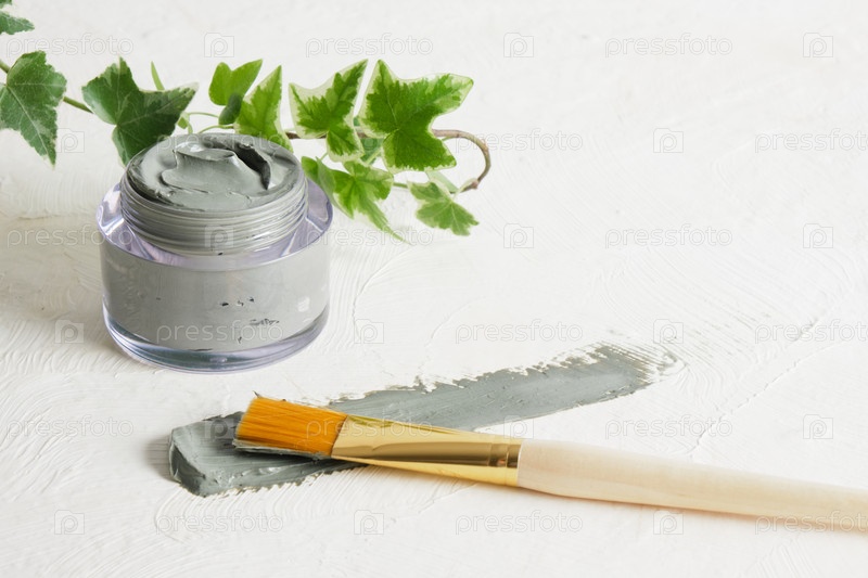 Кисточка для нанесения масок для лица, баночка косметической голубой глины и мазок глины на фактурном светлом фоне