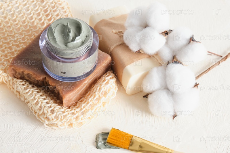 Косметическая голубая глина для лица и тела, кисть для нанесения глины и ватные цветы на светлом фоне