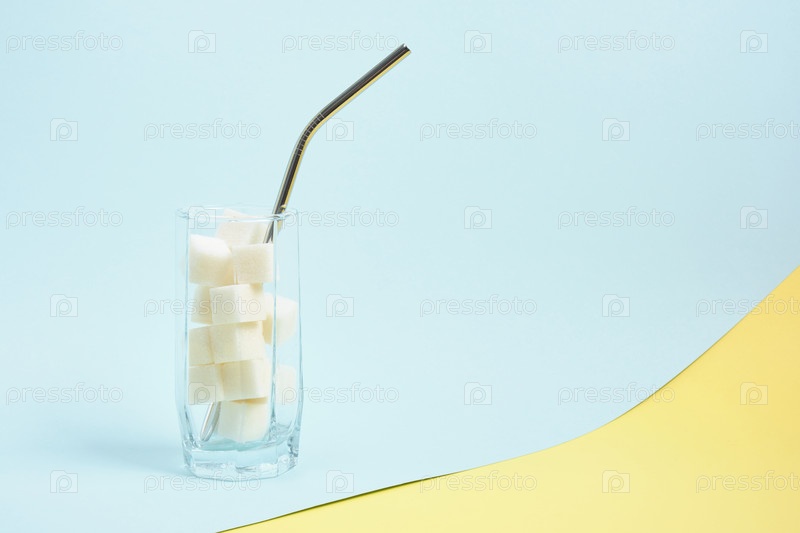 Коктейльная трубка и кубики сахара в стакане, синий и желтый фон, высокое содержание сахара в напитках и концепция продуктов питания