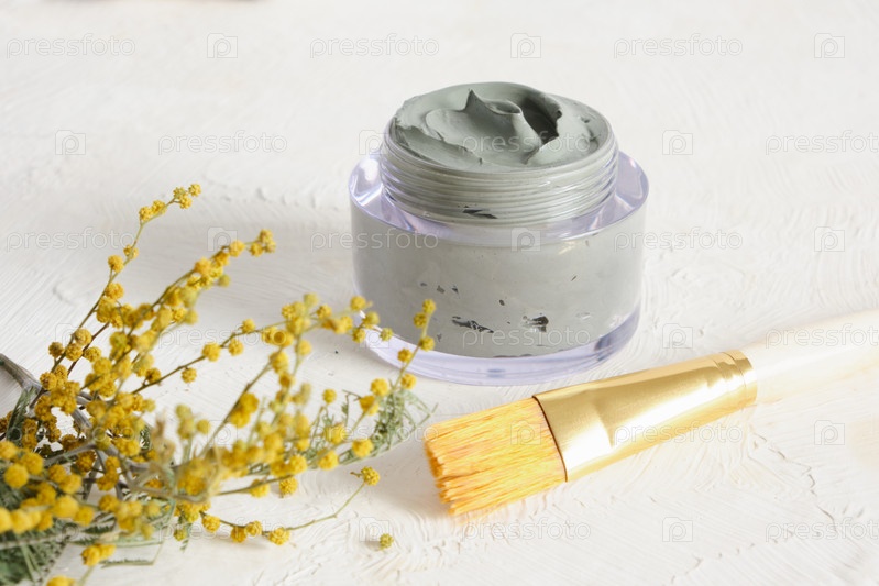 Косметическая голубая глина для лица и тела, кисточка для нанесения масок для лица и мимоза на светлом фоне