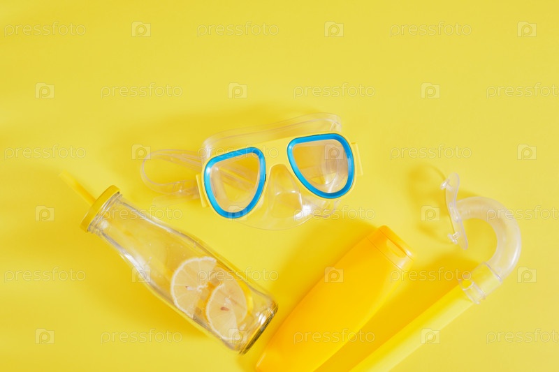 Маска для дайвинга, солнцезащитный крем и бутылка лимонада на желтом фоне