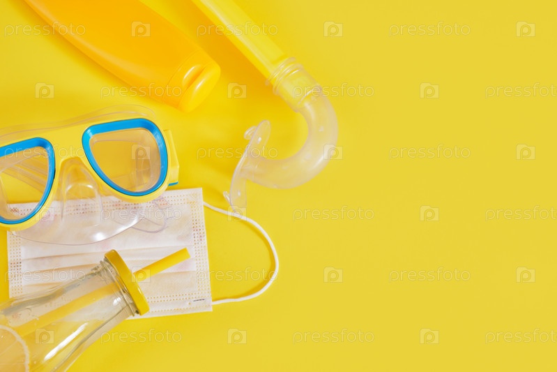 Маска для дайвинга, защитная медицинская маска, солнцезащитный крем и бутылка лимонада, концепция пляжного отдыха в изоляции