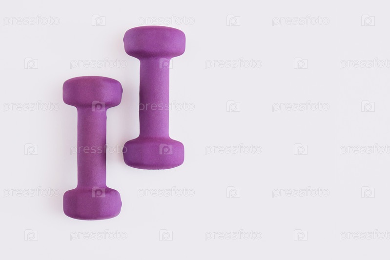 Две сиреневые гантели на сером фоне копией пространства