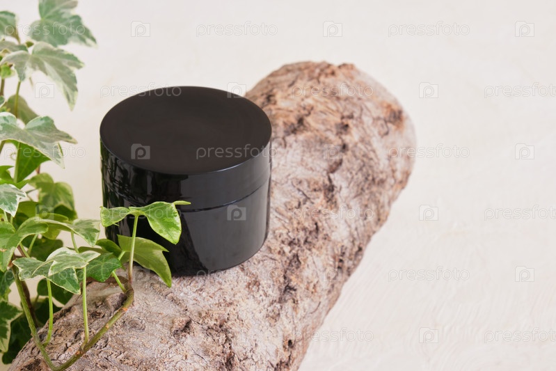 Пустая косметическая баночка с черным кремом на коре дерева. Концепция натуральной косметики. бежевый фон копия пространства макет, зеленые листья растений