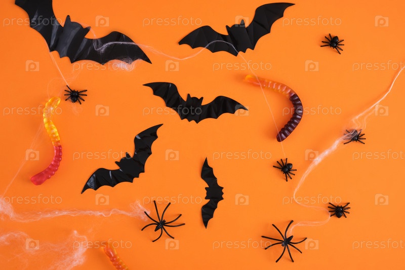 Концепция украшения хэллоуина мармеладные черви, пауки, паутина и летучие мыши на оранжевом фоне, фон хэллоуина
