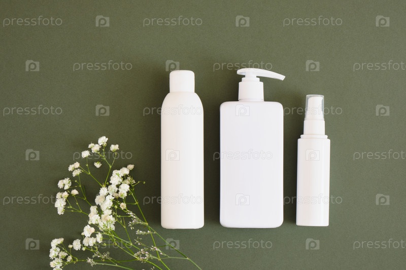 Три разные пустые белые бутылки на темно-зеленом фоне, макет косметики