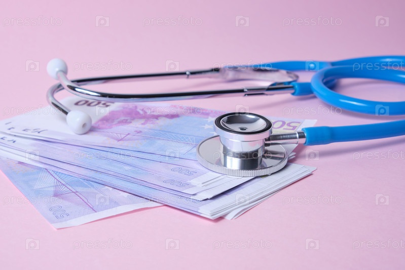 Стетоскоп и банкноты евро на розовом фоне, концепция влияния кризиса на обменный курс