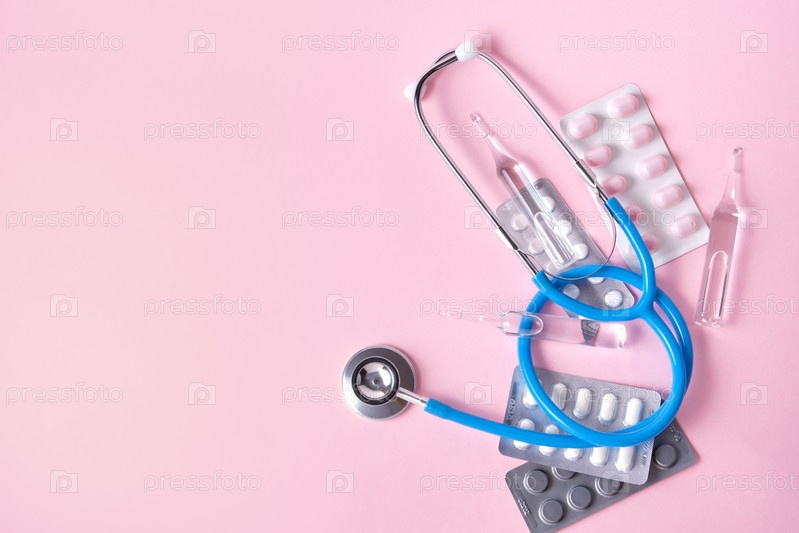Медицинское оборудование, стетоскоп, ампулы и шприц на розовом фоне